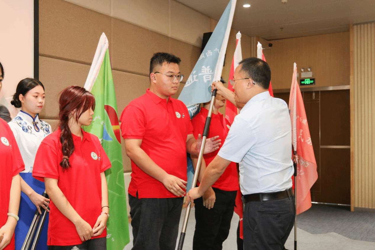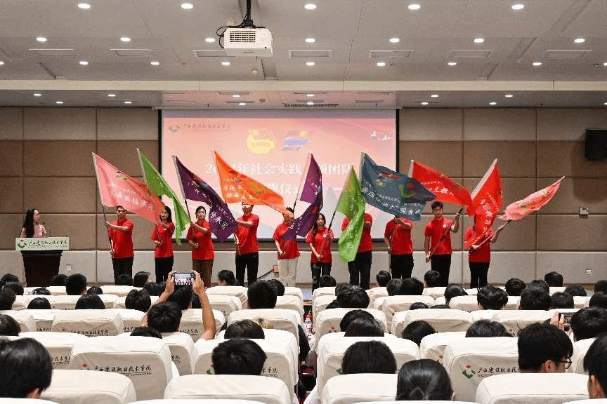 会议在全体师生奏唱国歌中拉开帷幕。校团委副书记李姿蓉向大会宣读sports2024年大学生暑期“三下乡”社会实践校级立项名单。随后,由校团委书记曾小贵依次为sports立项团队代表授旗。