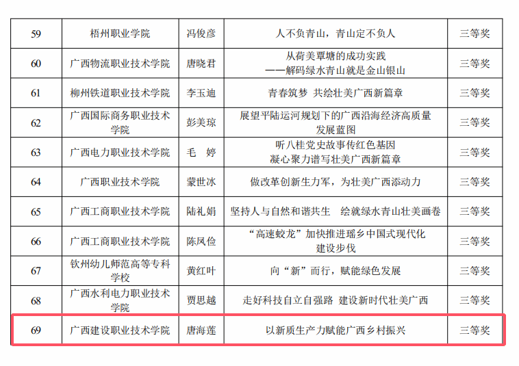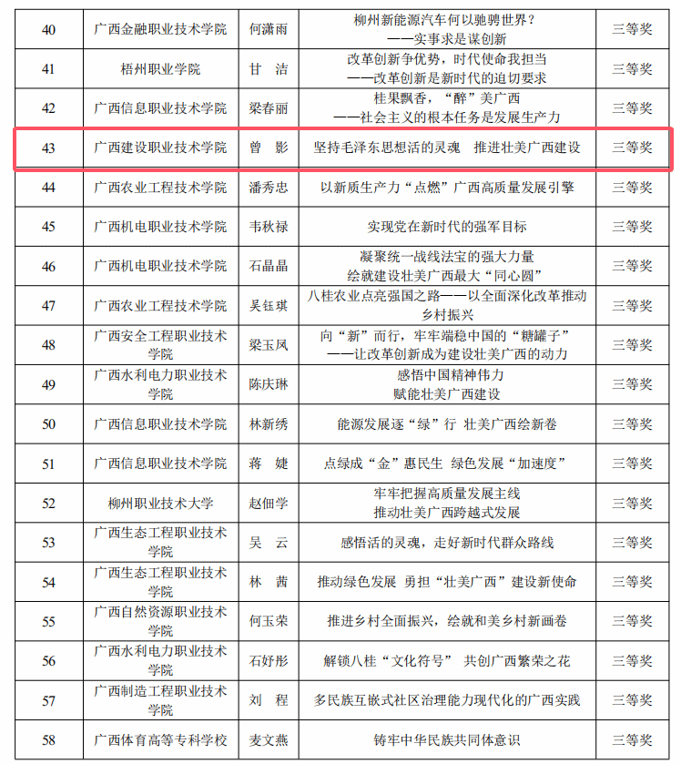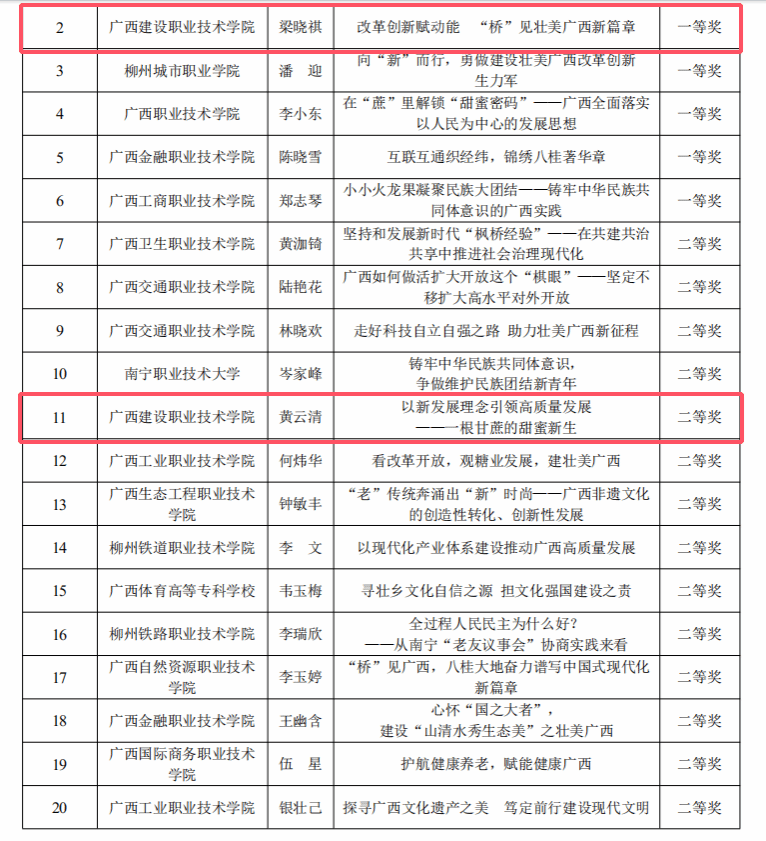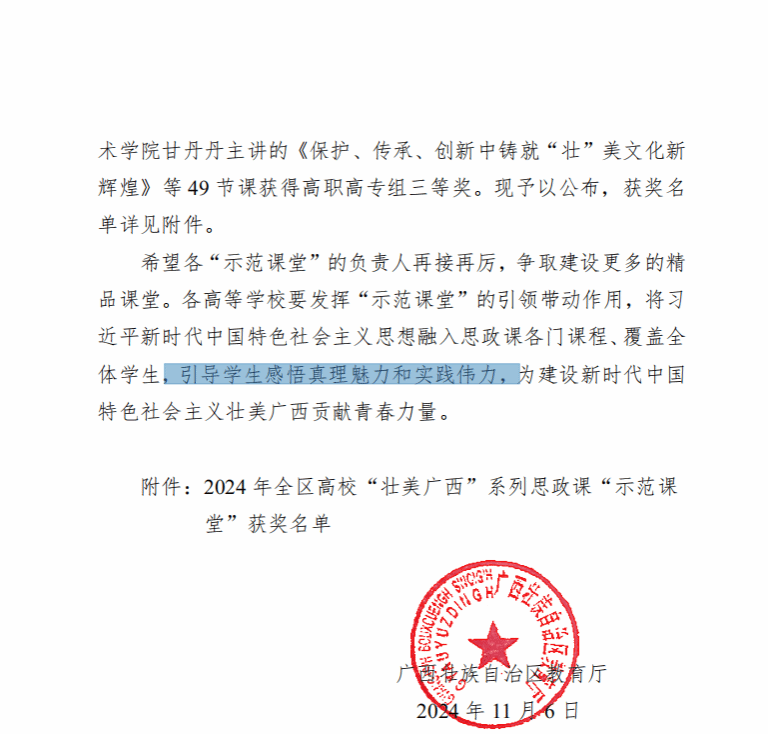 广西建院11月13日讯(马克思主义学院 宋佳雄)近日,自治区教育厅公布了2024年全区高校“壮美广西”系列思政课“示范课堂”获奖名单。sports马克思主义学院思政课教师梁晓祺参评的作品《改革创新赋动能 “桥”见壮美广西新篇章》荣获高职高专组一等奖,黄云清老师参评的作品《以新发展理念引领高质量发展—一根甘蔗的甜蜜新生》荣获高职高专组二等奖,曾影、唐海莲老师参评的作品《坚持毛泽东思想活的灵魂 推进壮美广西建设》《以新质生产力赋能广西乡村振兴》分别荣获高职高专组三等奖。