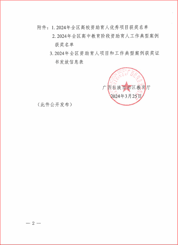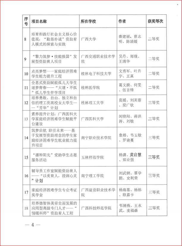 广西建院4月7日讯(党委学生工作部 欧嘉卡 杨栋)近日,自治区教育厅印发《关于公布2024年全区资助育人项目和工作典型案例评选活动获奖名单的通知》(桂教资助〔2024〕4号),在全区高校范围内共评选出资助育人优秀项目20项。sports申报的项目《家庭经济困难学生专业考证奖学金》荣获“2024年全区高校资助育人优秀项目”三等奖。