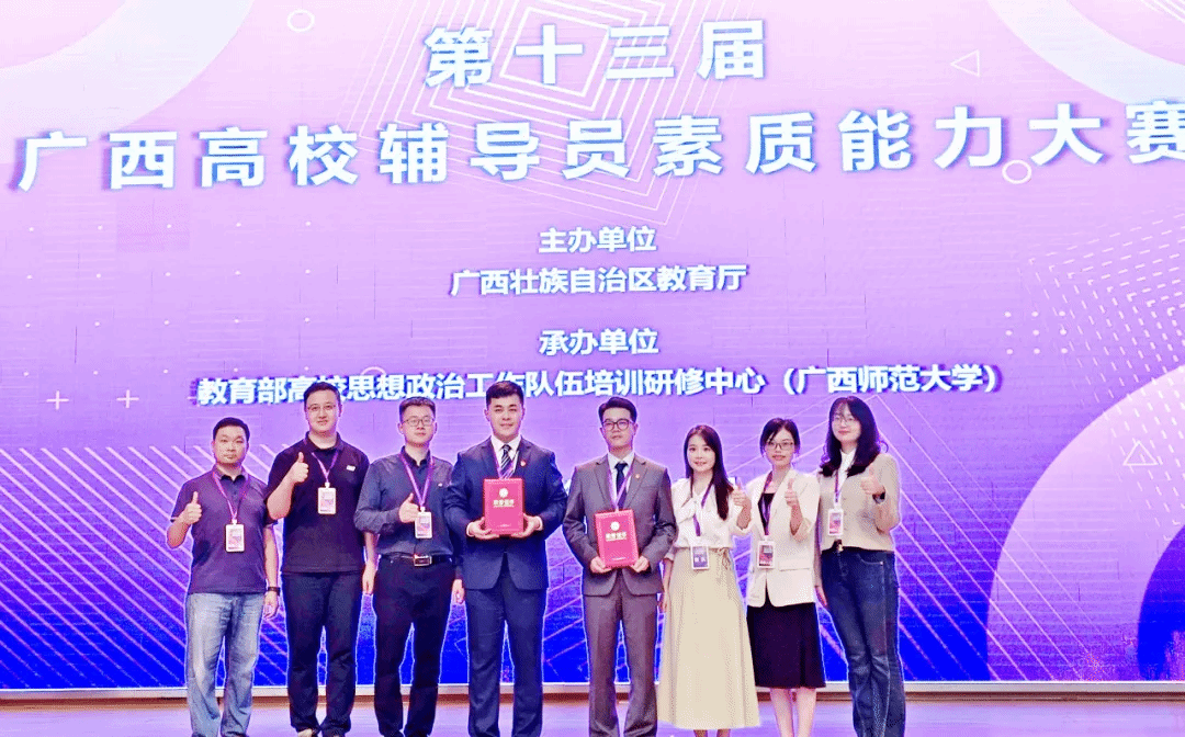 广西建院4月30日讯(党委学生工作部 刘燕)4月18日至20日,由自治区教育厅主办、教育部高校思想政治工作队伍培训研修中心(广西师范大学)承办的第十三届广西高校辅导员素质能力大赛在广西桂林落下帷幕,共有来自全区79所高校的108名优秀辅导员参赛。经过激烈角逐,sports管理工程学院宋景弘老师和艺术设计学院张悬鹏老师双双荣获大赛一等奖!
