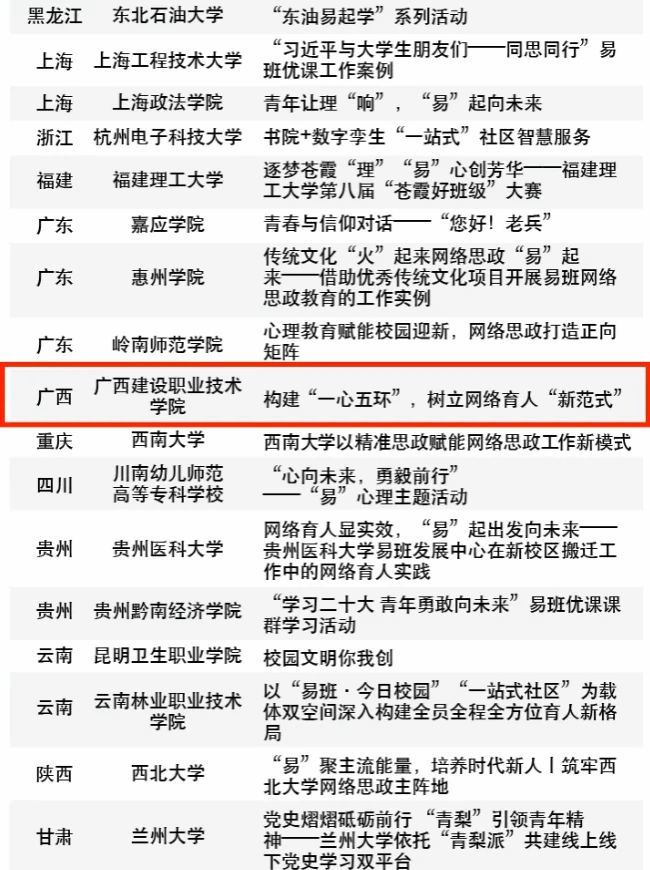 广西建院5月13日讯(党委学生工作部 黄楚凌)5月10日,教育部易班发展中心公布了2023年度全国易班共建优秀名单,sports工作案例《构建“一心五环”,树立网络育人“新范式”》入选2023年度优秀易班共建案例。全区共五所高校入选,sports是入选的广西两所高职院校之一。