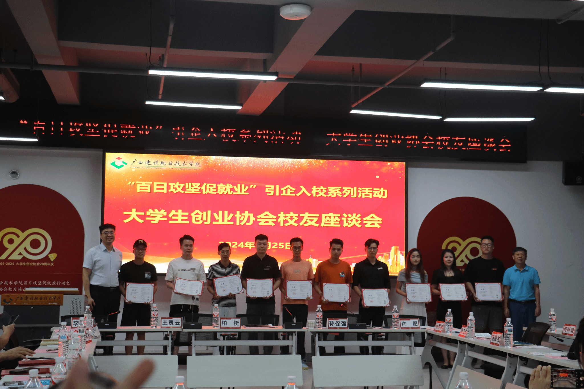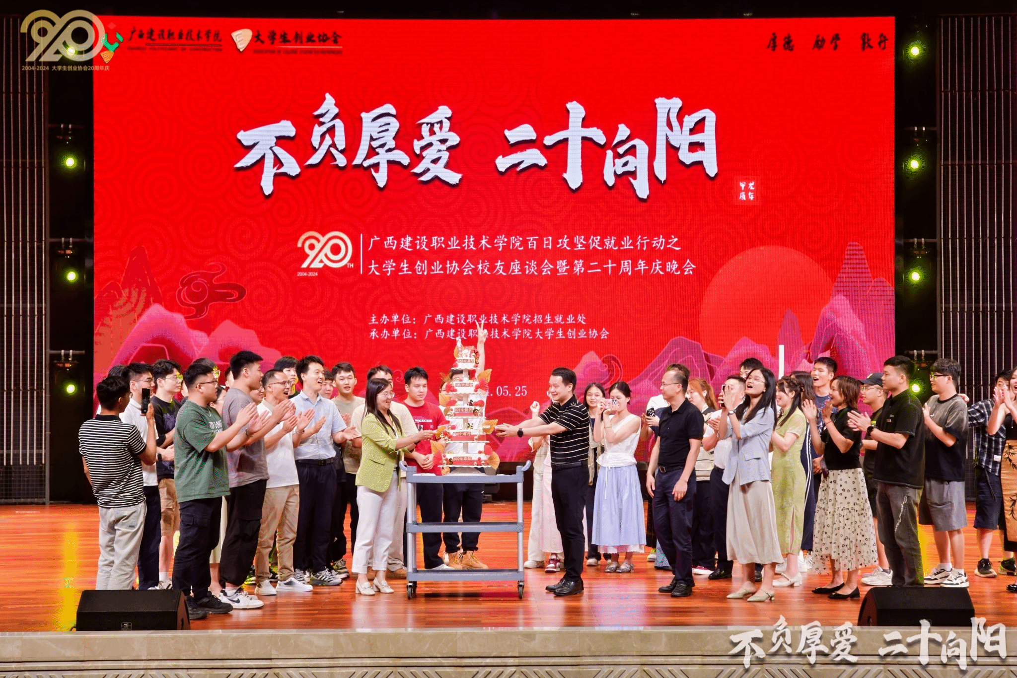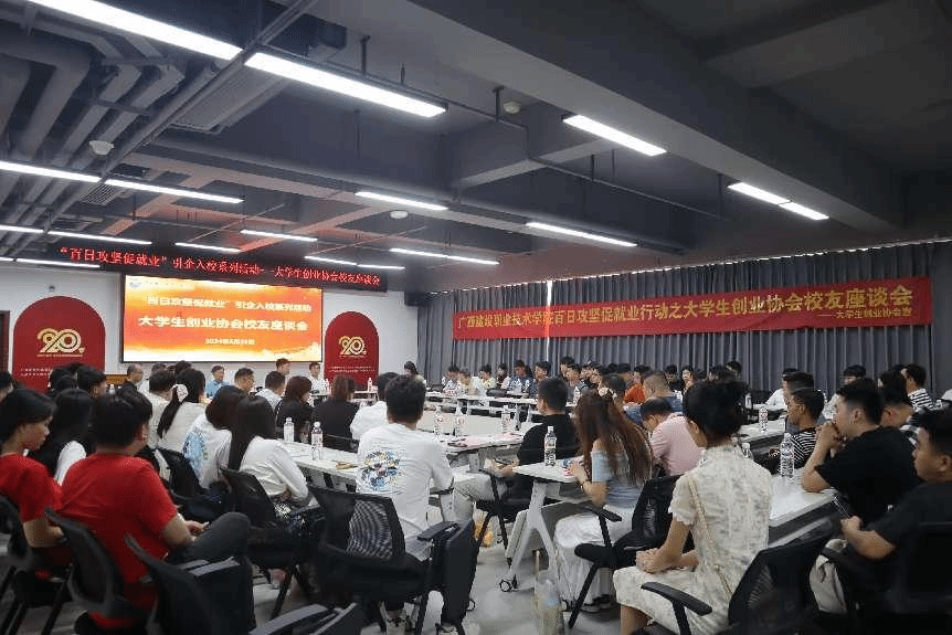广西建院5月27日讯(文/招生就业处 练翠滢 图/创业协会)为全面总结大学生创业协会的发展成绩和经验,促进和加强协会校友间、校友与母校间的联系,发挥校友在毕业生就业中的积极作用,5月25日,大学生创业协会举行校友座谈会暨20周年庆祝活动。学校副校长柏挺,校友办常务副主任王灵云、招生就业处副处长晏毅、历任及现任指导老师和返校协会校友代表,共计140余人参加校友座谈会,招生就业处处长孙保强主持会议。