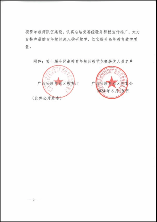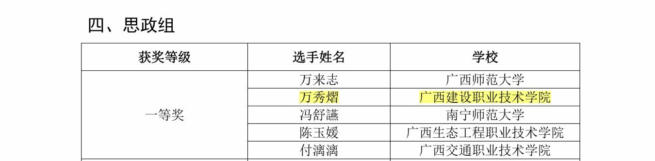 广西建院6月25日讯(教师发展中心 张望)近日,由自治区教育厅、自治区总工会联合举办的第十届全区高校青年教师教学竞赛在广西师范大学圆满落下帷幕。来自全区75所高校259名教师参加初赛,58所高校的134名教师晋级决赛。经过激烈角逐,sports马克思主义学院教师万秀熠荣获思政组一等奖、人文教育学院教师林怡荣获理科组一等奖、市政与交通学院教师宋柳荣获工科组二等奖。