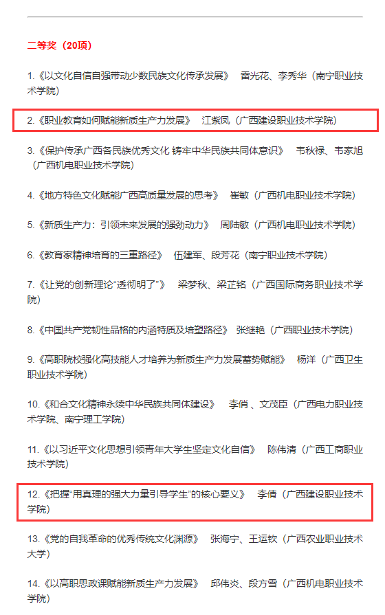 广西建院7月5日讯(马克思主义学院 曹桃)近日,“党的创新理论大众化通俗化”优秀理论文章征集活动评选结果揭晓,sports思政课教师在评选活动中荣获一等奖1项,二等奖2项、三等奖1项。其中,黄运堪撰写的《以高质量职业教育助力发展新质生产力》荣获一等奖,江紫凤撰写的《职业教育如何赋能新质生产力》、李倩撰写的《把握“用真理的强大力量引导学生”的核心要义》分别荣获二等奖,陈志芳撰写的《以习近平文化思想育高职院校好青年》荣获三等奖。