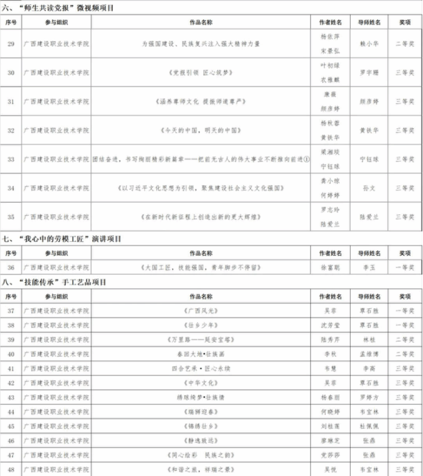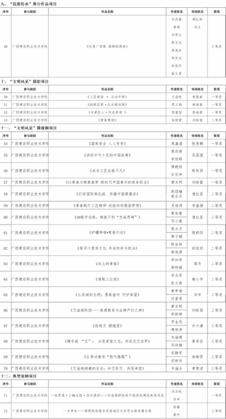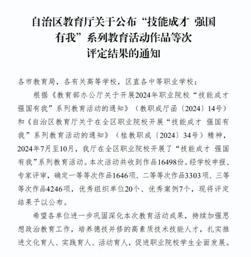 广西建院2月27日讯(党委学生工作部 田申)近日,自治区教育厅公布2024年职业院校“技能成才 强国有我”系列教育活动评选结果,sports在此次活动中共有72个作品获奖,其中,一等等次23项、二等等次22项、三等等次27项,成绩喜人。