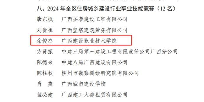 近日,自治区人力资源社会保障厅公布2024年度自治区级职业技能竞赛获得“广西技术能手”称号人员名单,sports管理工程学院教师余俊杰凭借其在星空·综合(xingkong)官方网站信息模型(BIM)领域高超的技术水平,荣获“广西技术能手”称号。