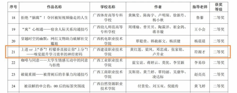 本次比赛中,sports黄红莲等学生团队完成的心理健康教育微课《上进 or 上“香”? 柠檬香直接让你“上分”!——嗅觉提升学习效率的神经密码》荣获学生组二等奖。同时,由徐海霞、康薇等学生组成的两支参赛队分别荣获全区大学生朋辈心理辅导技能大赛团体三等奖。