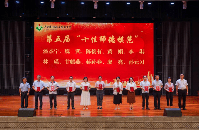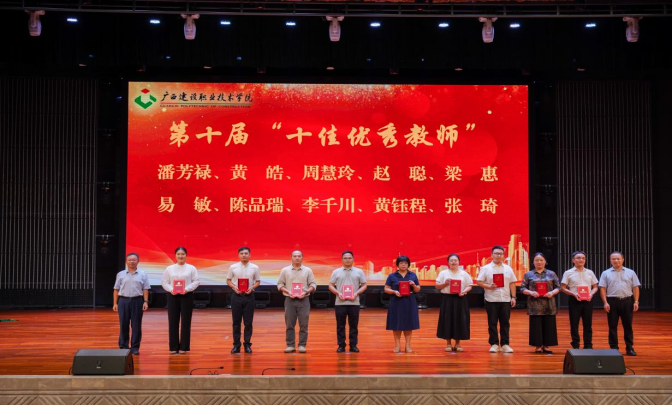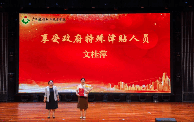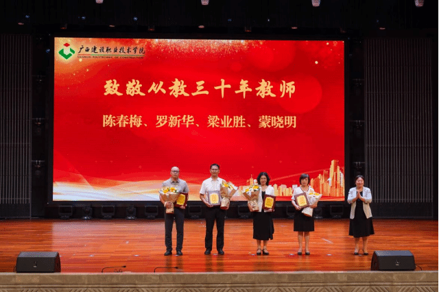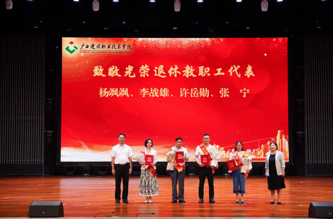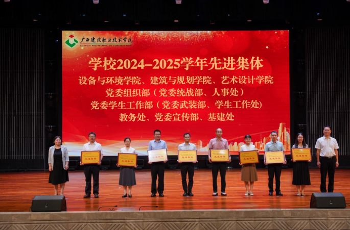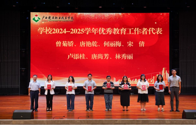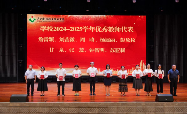 会议为享受政府特殊津贴人员、学校“从教30年”教师、学校2025年退休教职工,获评第三届“校级教学名师”、第五届“十佳师德模范”、第十届“十佳优秀教师”,2025年广西职业院校教师教学技能大赛课堂教学比赛获奖团队代表,获学校2024-2025学年先进集体的部门以及获2024-2025学年学校“优秀教师”“优秀教育工作者”的代表进行了表彰并颁发证书。