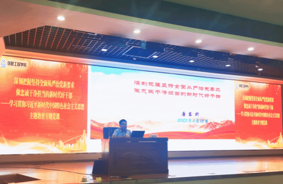 广西建院6月14日讯(信息工程学院 徐田保)为推动学习贯彻习近平新时代中国特色社会主义思想主题教育走深走实,激励和引导党员干部把学习热情转化为攻坚克难、干事创业和开拓创新的强大动力,6月13日,学校纪委书记唐东升在四教二楼报告厅为信息工程学院教职工、学生代表以及学校纪检监察干部作了题为《深刻把握坚持全面从严治党要求做忠诚干净担当的新时代好干部》的专题党课。