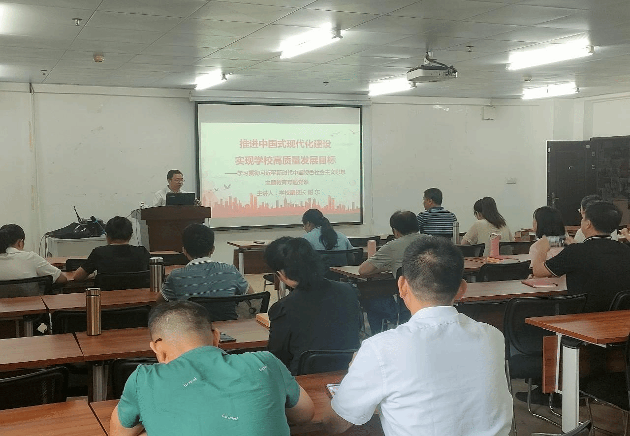 广西建院6月30日讯(市政与交通学院 韦新)6月28日,学校副校长谢东在1教910会议室为市政与交通学院党总支全体党员作题为“推进中国式现代化建设 实现学校高质量发展目标”的主题教育专题党课。