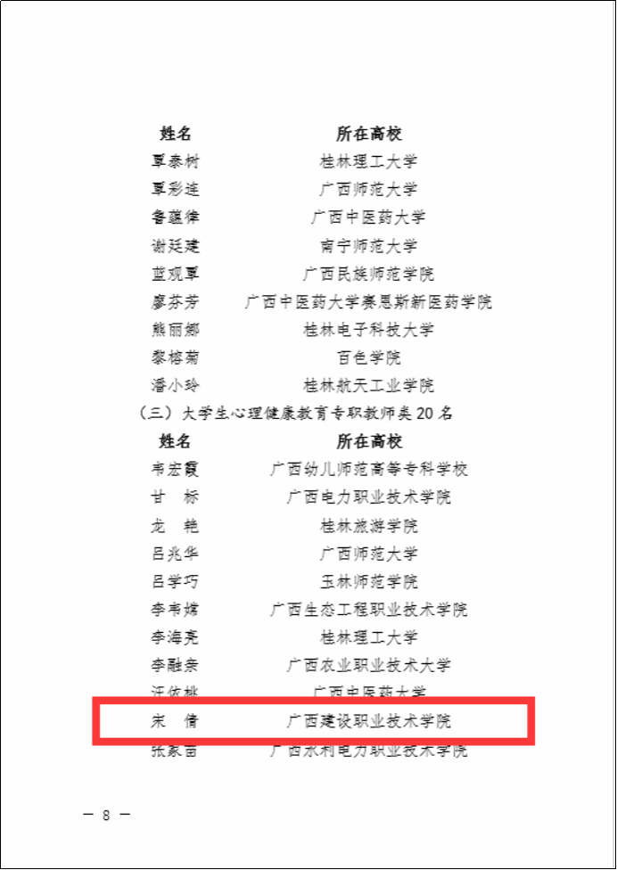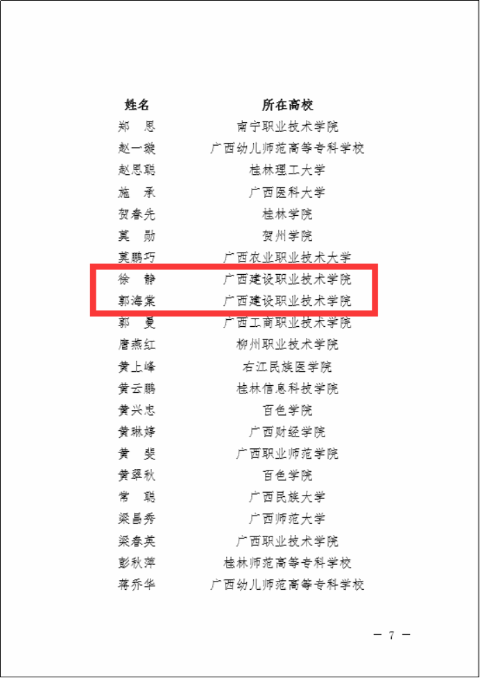 广西建院8月3日讯(管理工程学院 郭海棠 黄春)近日,广西壮族自治区教育厅公布了“广西高校思想政治教育卓越教师”支持计划第一期支持对象人选名单,sports党委学生工作部宋倩老师入选“骨干教师”(大学生心理健康教育专职教师类)、管理工程学院郭海棠老师和设备与环境学院徐静老师入选 “骨干教师”(专职辅导员类)。