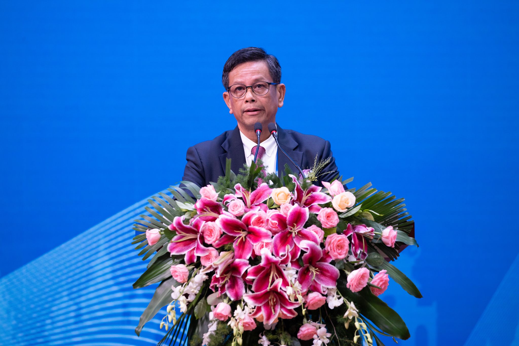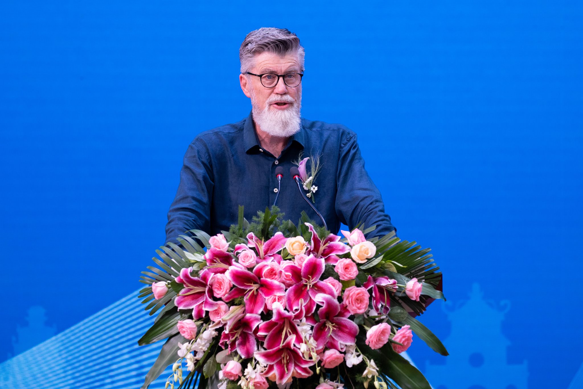 新西兰国际教育交流协会会长默里·伯顿、柬埔寨国家技术培训学院校长约克·索伊分别致辞。