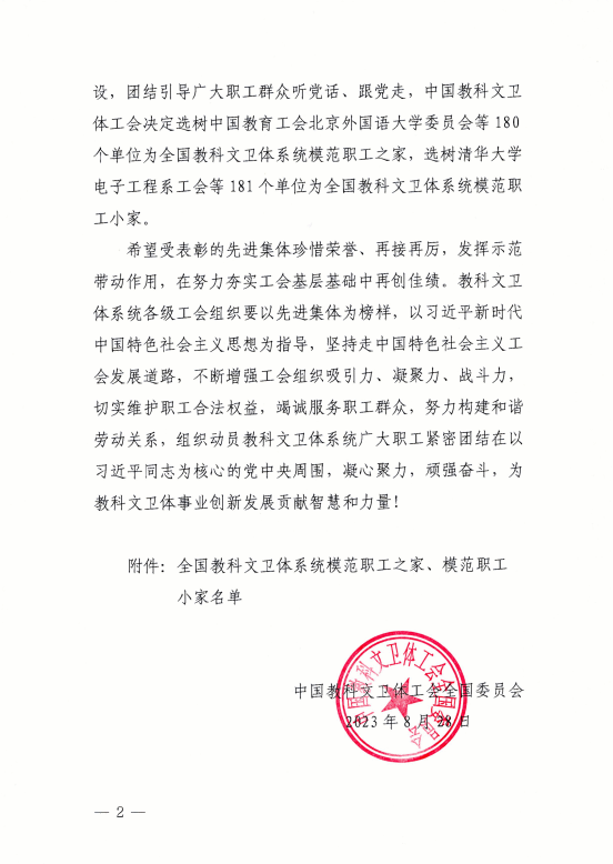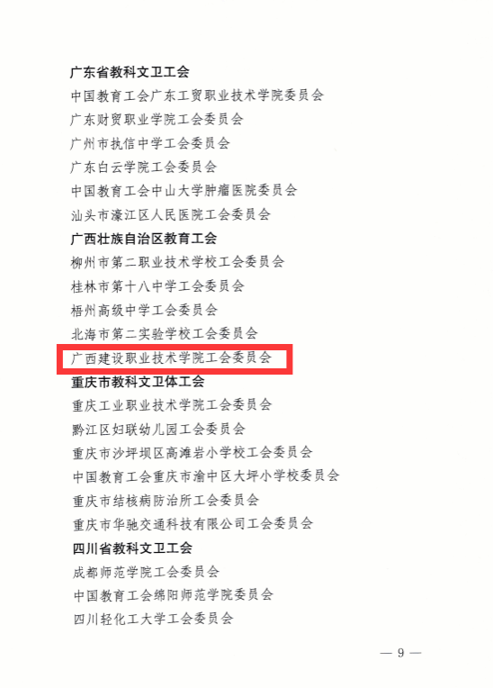 广西建院9月18日讯(工会 陆康)近日,中国教科文卫体工会全国委员会印发《关于确认全国教科文卫体系统模范职工之家、模范职工小家的通知》(教科文卫体工发﹝2023﹞14号),sports工会被中国教科文卫体工会全国委员会确认为全国教科文卫体系统模范职工之家。这是全面评价工会工作的综合奖项,是sports工会有史以来被授予的最高荣誉,全区只有5所学校获此殊荣,sports是其中唯一一所高校。