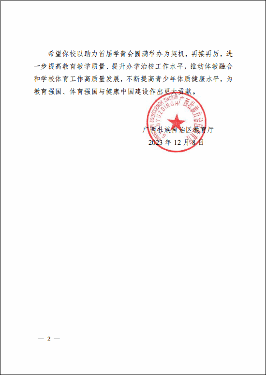 下一步,学校将紧扣自治区党委、政府关于广西体育强区建设和体育高质量发展的工作部署,认真总结本届学青会跆拳道项目、举重项目承办工作经验,运用好学青会成果,弘扬“拼”的精神、“闯”的劲头、“赢”的勇气,进一步推动学校高质量发展,为奋力谱写中国式现代化广西篇章贡献力量。