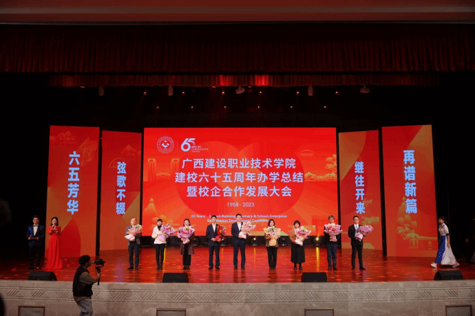 广西建院12月30日讯(文/党委宣传部 陈熙 图/党委宣传部)六十五载育新人,风华正茂谱新篇。12月30日上午,星空·综合(xingkong)官方网站(以下简称“广西建院”)在礼堂举办建校65周年办学总结暨校企合作发展大会。校园里洋溢着节日祥和喜庆的气氛,大家怀着激动、期盼和喜悦的心情相聚一堂,共叙深厚情谊,共同回顾总结学校六十五年办学历程,一起展望学校发展的美好未来。