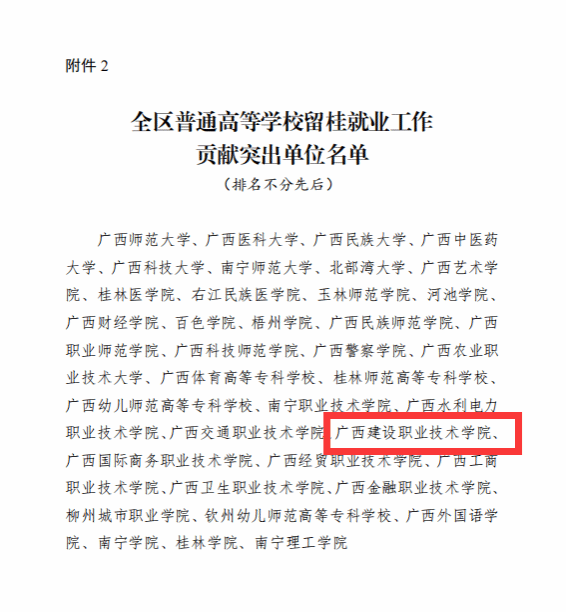 广西建院12月29日讯(招生就业处 覃春华)近期,自治区教育厅下发《关于认定2023年全区普通高等学校就业创业工作突出单位和留桂就业工作贡献突出单位的通知》(桂教学生〔2023〕16号),sports荣获“全区普通高等学校就业创业工作突出单位”“留桂就业工作贡献突出单位”荣誉称号。