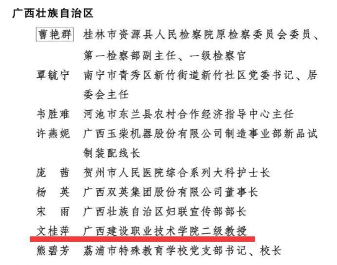 广西建院3月4日讯(工会 戴跃燕)3月3日,全国妇联公布了2023年度全国三八红旗手标兵、全国三八红旗手、全国三八红旗集体全名单。sports管理工程学院文桂萍老师荣获2023年度全国三八红旗手称号。