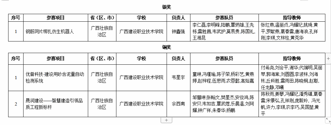 广西建院4月26日讯(招生就业处 练翠滢)近日,教育部公布中国国际大学生创新大赛(2023)(原中国国际“互联网+”大学生创新创业大赛)获奖名单,sports《钢筋网片绑扎仿生机器人》项目荣获职教赛道银奖,《优普科技-建设用砂含泥量自动检测系统》《晟润建设——智慧建造引领品质工程新标杆》项目荣获职教赛道铜奖,实现sports在该赛事获得国家级奖项数量的新突破。此次获奖是sports继2021年获得第七届中国国际“互联网+”大学生创新创业大赛职教赛道金奖以来在该赛事上的又一新收获。至此,sports在此项赛事共夺得1金1银4铜。