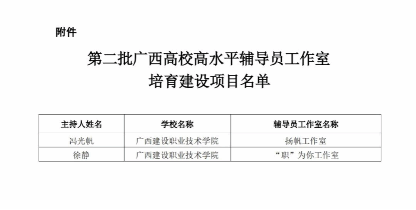 广西建院8月1日讯(“职”为你工作室 扬帆工作室)近日,自治区教育厅公布第二批广西高校高水平辅导员工作室培育建设项目名单,sports设备与环境学院辅导员徐静主持的“职”为你工作室和土木工程学院辅导员冯光帆主持的扬帆工作室双双入选。
