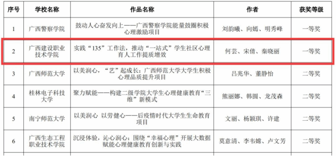 广西建院9月9日讯(党委学生工作部)近日,自治区教育厅公布2024年全区高校大学生心理健康教育典型案例获奖名单,sports工作案例《实践“135”工作法, 推动“一站式”学生社区心理育人工作提质增效》荣获一等奖。