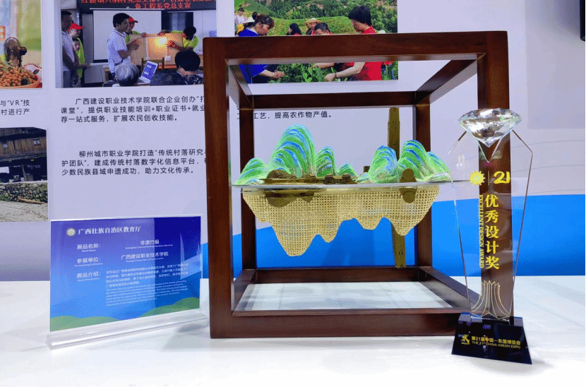 广西建院9月30日讯(艺术设计学院 文/陆筱欣 图/周晗)9月28日,第21届中国—东盟博览会展品评选活动的颁奖典礼在南宁举办。此次活动汇聚了近45个国家、超2000家企业参展,共展出4000余件精美展品。经过由中国与东盟十国行业专家组成的评审团的严格筛选,最终颁发了10个金奖、20个银奖、15个优秀设计奖及15个最高人气奖。由sports民族工艺(瑶族竹藤草芒编织技艺)自治区示范性民族文化传承创新职业教育基地主创人员陈菲菲、欧阳普龙、曾睿、陆剑鸣、蒙晓明、陆筱欣、罗筠乔、张苑、何游等老师,携手民间竹编技艺匠人陈丹丹、黎作洲共同研发的非遗创新设计作品《桂青若绿》在此次评选中脱颖而出,荣获优秀设计奖。
