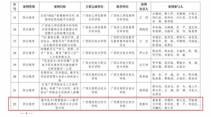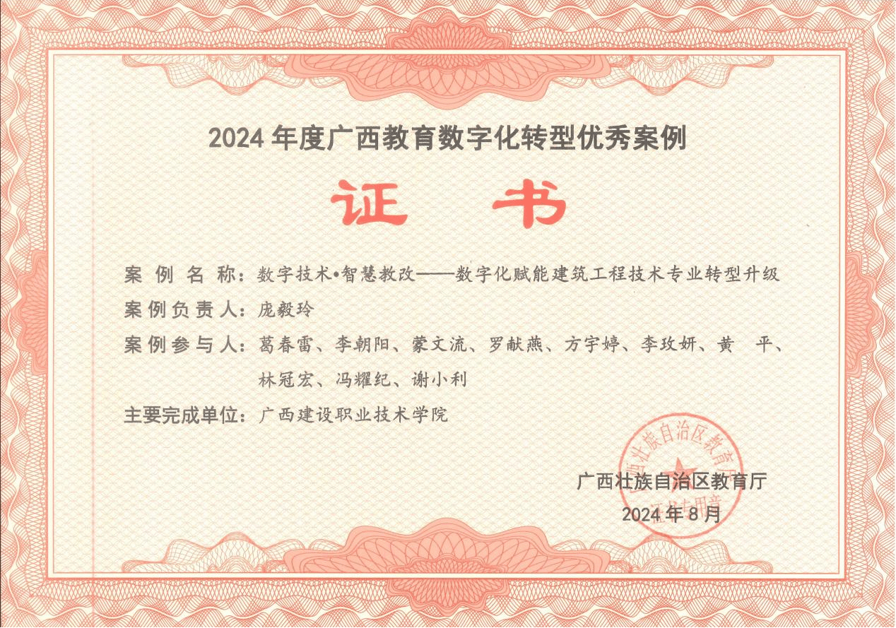 广西建院10月8日讯(土木工程学院 韦东余)日前,自治区教育厅公布了2024年度教育数字化转型优秀案例名单,共确定高等教育优秀案例13个、职业教育优秀案例30个、基础教育优秀案例57个(含区域案例和学校案例)。我校报送的《数字技术˙智慧教改——数字化赋能星空·综合(xingkong)官方网站工程技术专业转型升级》入选职业教育优秀案例。该工作案例由土木工程学院庞毅玲教授负责,土木工程学院葛春雷、李朝阳、蒙文流、罗献燕、方宇婷、李玫妍、黄平、林冠宏、冯耀纪、谢小利等10位教师共同参与完成。