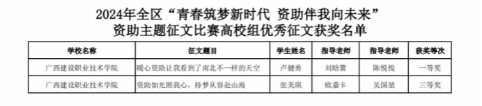 广西建院10月20日讯(文/杨栋)近日,自治区教育厅公布2024年全区“青春筑梦新时代 资助伴我向未来”资助主题征文比赛获奖名单,sports选送的两个作品分别荣获一等奖和三等奖,指导老师获评优秀指导老师。