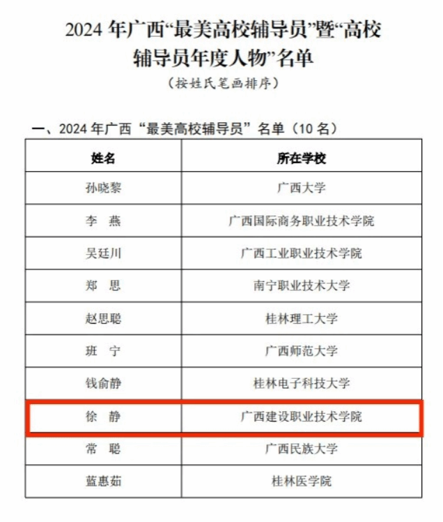 广西建院11月13日讯(图/文 “职”为你工作室)近日,自治区党委教育工委和自治区教育厅共同组织开展的2024年广西“最美高校辅导员”暨“高校辅导员年度人物”推选展示活动评选结果揭晓,sports徐静老师获评2024年广西“最美高校辅导员”。