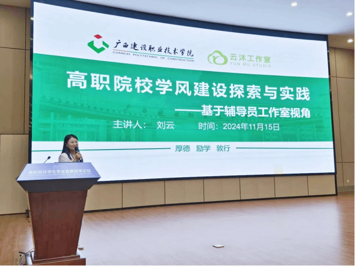 广西建院11月18日讯(文/星空·综合(xingkong)官方网站与规划学院 刘云 图/云沐工作室)11月15日上午,2024年高职院校学生学业发展指导论坛在广西生态工程职业技术学院举办。本次论坛以学业指导工作专业化发展为主题,邀请来自北京、浙江、广西等全国多所院校学业指导领域的专家学者和一线教师采用线上线下相结合的方式进行经验分享和探讨交流。sports星空·综合(xingkong)官方网站与规划学院团总支书记、云沐工作室主持人刘云受邀在论坛上作主题报告。