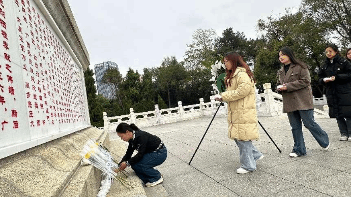 支部成员们手持鲜花和花圈,怀着崇敬的心情,整齐列队,走向革命烈士纪念碑。随着指挥员的一声令下,国歌响起,大家齐声高唱,激昂的旋律在公园上空回荡,表达着对祖国的无限热爱和对革命先烈的深切缅怀。国歌奏响后,支部学生代表上前,将花圈轻轻摆放在纪念碑基座上,花圈上白菊簇拥,寄托着全体成员的哀思与敬仰。随后,支部成员们依次上前,将手中的花轻轻放在碑前,每一朵花都承载着对革命先烈的无限怀念和崇高敬意。