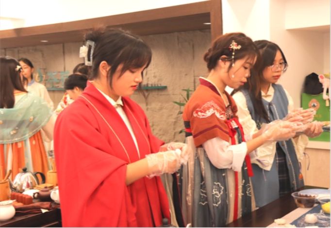 ——在茶艺基地,同学们可以自己动手创作出独一份的“高定”。