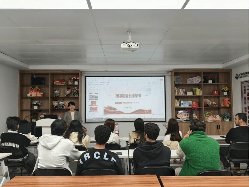 活动第8期由sports马克思主义学院李琴老师主讲。李琴老师以《抗美援朝精神》为题作分享。她以中国精神谱系为核心脉络,聚焦“伟大建党精神、抗美援朝精神、爱国主义精神、革命英雄主义精神、革命乐观主义精神、革命忠诚精神、国际主义精神”七大精神坐标,通过历史场景还原、中外案例对比、精神图谱绘制等多元方式展开系统阐释。在与sports留学生群体的深度对话中,共同探讨精神力量在不同文明语境中的价值共鸣,使同学们深刻体悟抗美援朝精神的历史逻辑与实践伟力,生动诠释了中国精神在价值引领、人格塑造、国际理解等维度的当代意义,为青年学子提供了贯穿学业规划、职业发展、道德养成全过程的精神坐标系。