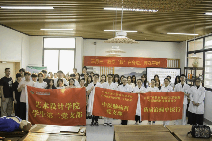 广西建院3月28日讯(文/艺术设计学院 覃芳芳 图/黄海文)为弘扬中华优秀传统文化,普及急救知识与中医养生技能,3月28日,艺术设计学院邀请自治区江滨医院(自治区第三人民医院)中医脑病科医护人员到sports开展“广西三月三,教你‘救’在身边,养在平时”主题活动。该学院学生第二党支部全体师生参与活动,共同体验中医魅力,学习急救技能。
