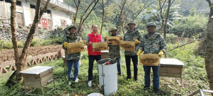 温昌盛(左二)和蜂民们在加八屯蜂蜜丰收现场