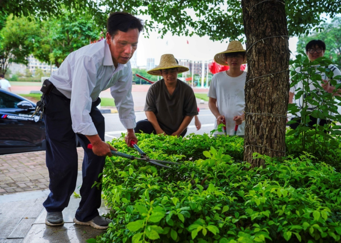 除了日常绿化养护等工作外,袁师傅还承担起劳动教育的重任,主要负责劳动周课程的实地教学,带领学生参与绿化劳动实践,手把手传授修剪、种植、除草等技巧,用生动的现场教学,激发同学们对劳动的热爱。学生们在翻土、播种、养护的过程中,练就吃苦耐劳的坚韧品格,同时也增强了同学们的责任感与团队协作能力。