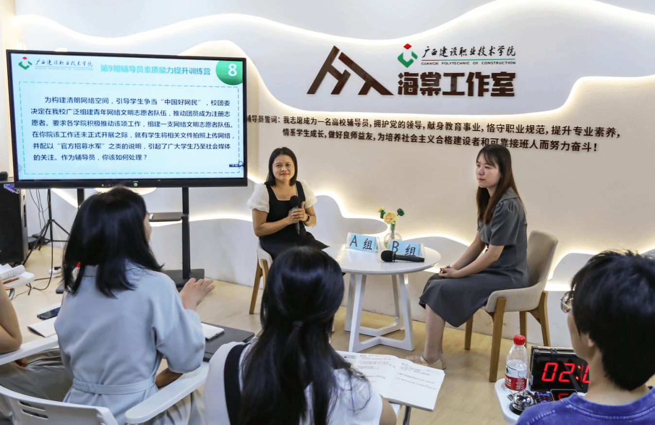 广西建院7月10日讯(管理工程学院 文/黄楚凌 图/宋景弘)为进一步推进sports辅导员队伍专业化、职业化建设,sports开办2023年辅导员素质能力提升训练营(以下简称“训练营”)。7月7日下午,训练营第9期培训在海棠工作室举办,来自7个二级学院的30位辅导员参加了培训。