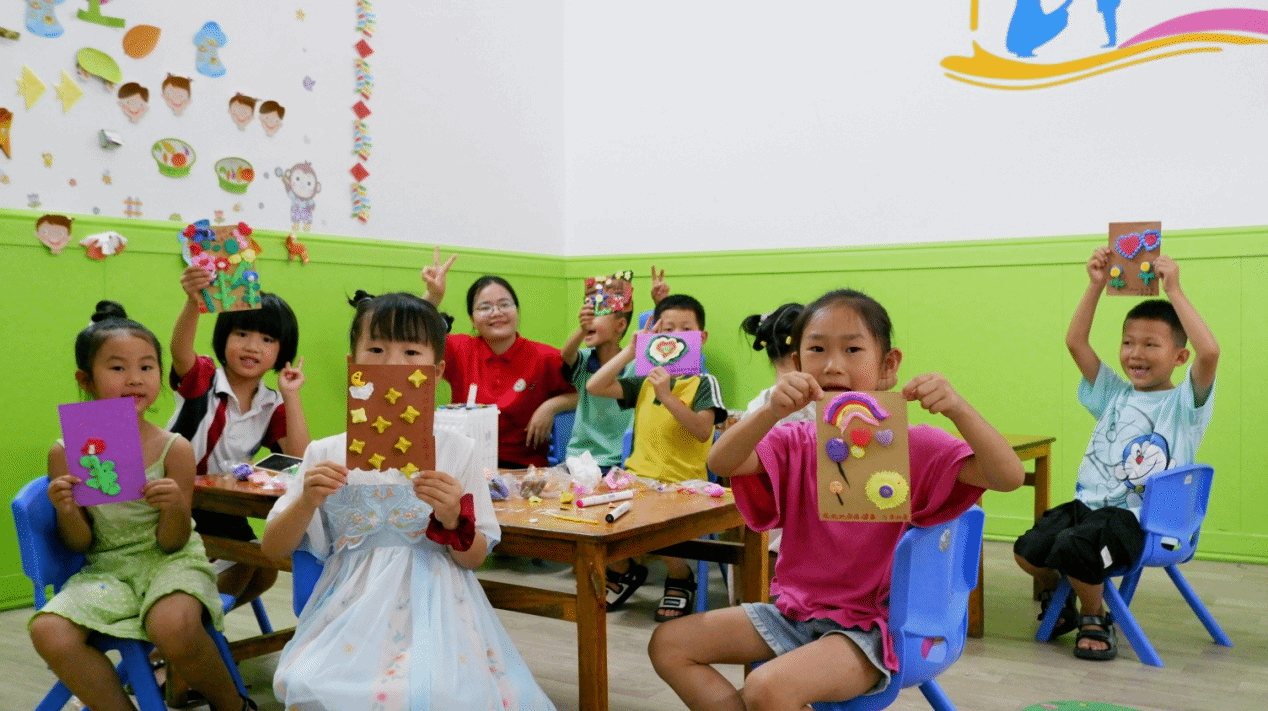 大手牵小手,小朋友们在实践团队的帮助下,制作完成了一件件充满童趣的手工作品。作品中有花草树木,有海底生物,有七彩斑斓的彩虹,也有一闪一闪的小星星。孩子们高举自己的作品,脸上洋溢着灿烂的笑容,在相机里留下难忘的瞬间。实践团队员们也被孩子们的快乐感染,所有的疲惫,在这一刻消失殆尽。