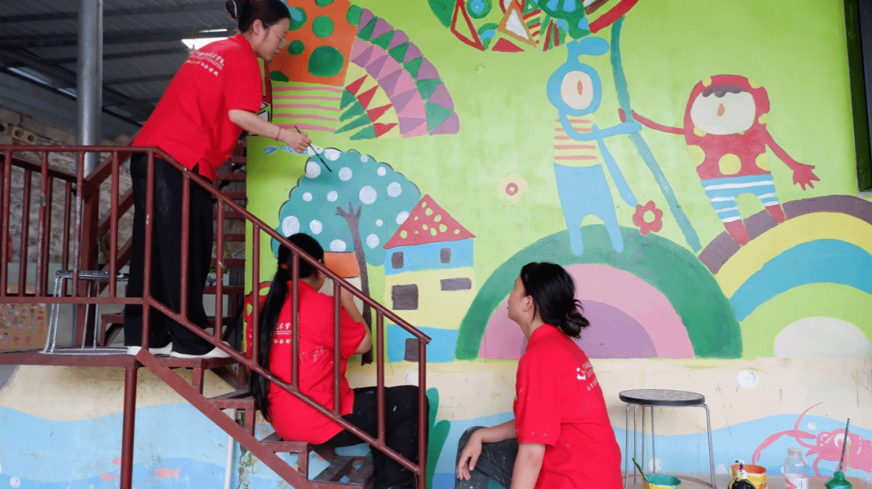 “绘美乡村”实践团为南丹县六寨镇苗苗幼儿园绘制楼梯墙面