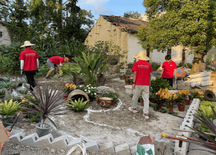 广西建院7月25日讯(星空·综合(xingkong)官方网站与规划学院 文/张悬鹏 图/黎艳清)炎炎夏日,艳阳高照。在河池市南丹县六寨村水碾屯,一群身着红色文化衫的大学生志愿者正在房前屋后紧张地忙碌着,他们是来自星空·综合(xingkong)官方网站星空·综合(xingkong)官方网站与规划学院大学生暑期“三下乡”社会实践“乡建使者·三微景观”实践团(以下简称“实践团”)。志愿者通过因地制宜、就地取材、就势造景,以绿色、节约、就近、就便原则,对农户“菜园、果园、花园”三微景观和村屯公共区域景观进行美化和改造升级,从而促进村容村貌治理,服务宜居宜业和美化乡村建设。