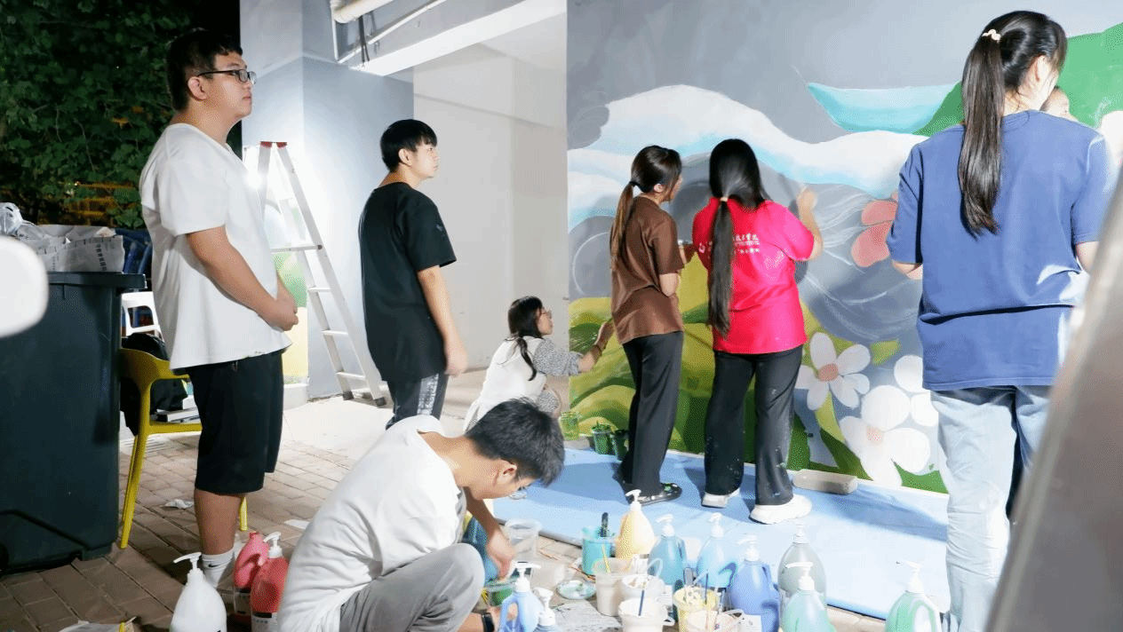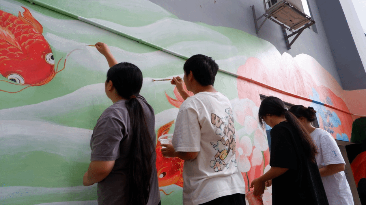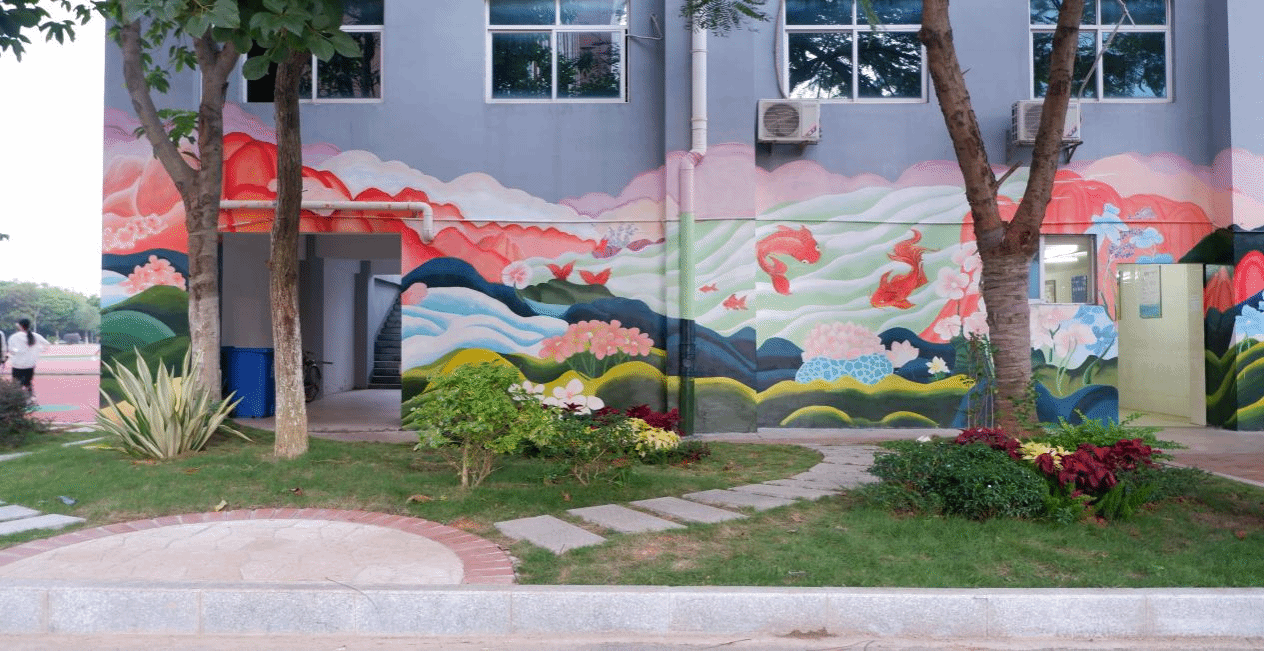 为提升智慧洗衣房的整体环境质量,在完成该区域的绿化改造后,师生们发挥手绘专业优势和墙绘实践经验,为智慧洗衣房精心绘制绿色生态主题文化墙,使整个洗衣房与其周围环境浑然一体,和谐统一。