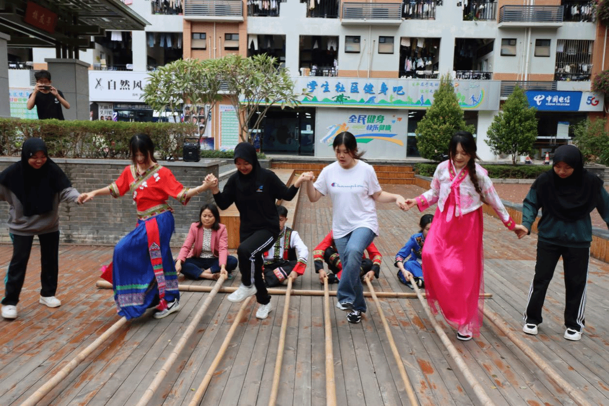当第一位留学生稍带羞涩地站在竹竿前排时,现场响起了热烈的掌声……合合-开开、合合-开开……在同学们有节奏的打竿下,师生们陆续加入了舞蹈队伍。大家手拉手,心连心,伴随着欢快的节奏一起舞蹈。课堂在轻松愉快的氛围中结束,但同学间友谊的桥梁已经通过竹竿舞搭建起来,大家舞动着青春活力,也传递着温暖与友善。