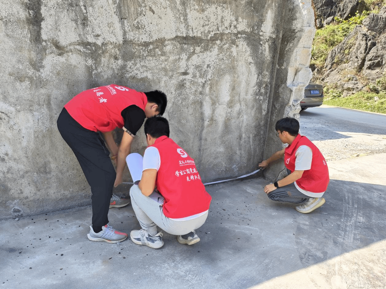 向美而行,绘就乡村美丽画卷。该院“绘美乡村·传承添彩”是学校优秀实践品牌项目。2020年、2021年暑期“三下乡”期间,该院师生在河池都安龙湾乡群乐村村部绘制了《乡村振兴战略》《美在乡村》两面墙绘。本次活动期间,该院师生勘察了这两幅墙绘的主体情况并确定修缮方案,对掉色严重的墙面进行初步清理,根据实际情况调配颜色进行补色。为持续打造“绘美乡村”主题墙绘,师生们还赴澄江镇自成村测量适合进行墙绘的墙体尺寸,为下一步志愿服务活动提前谋划。
