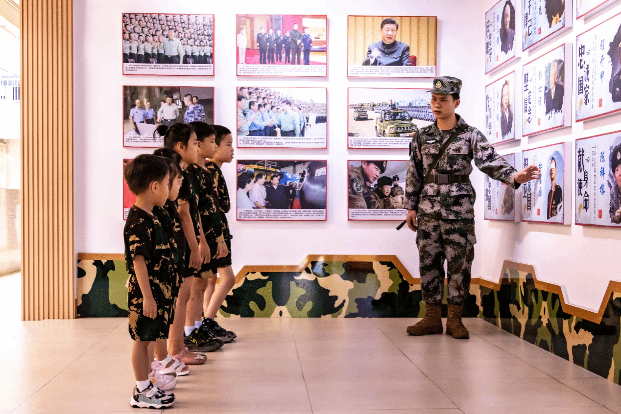 活动现场,“国防小先锋”们身穿迷彩服,精神抖擞地参与各项国防教育活动。在国防教育工作室,退役复学大学生向孩子们展示了各种军事装备模型,让他们感受国防科技的魅力。孩子们充满好奇地围着装备模型转,不时向退役复学大学生们提问,对国防知识产生了浓厚的兴趣。