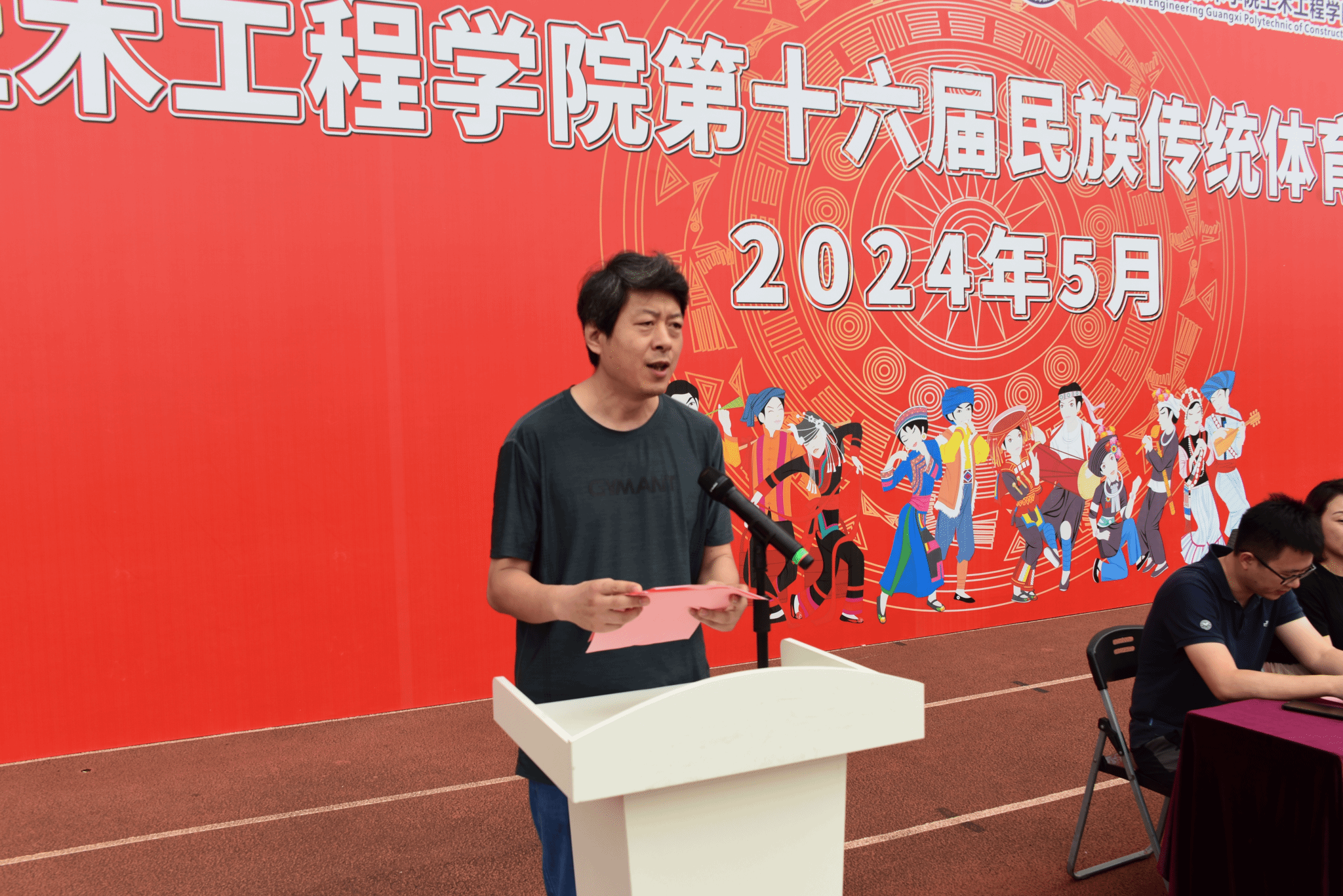 广西建院5月29日讯(土木工程学院 文/石明成 图/王海昕 黄健 韦景朝)为弘扬中华民族优秀传统文化,全面促进学生身心健康,5月28日下午,土木工程学院在学校田径场举办第十六届民族传统体育运动会开幕式。土木工程学院党总支书记孔祥刚,院长李朝阳,副院长葛春雷、罗献燕等学院领导出席,全体辅导员、班主任代表以及全体在校学生参加开幕式。