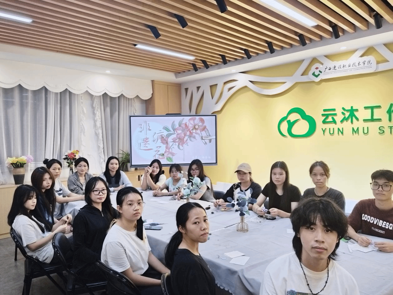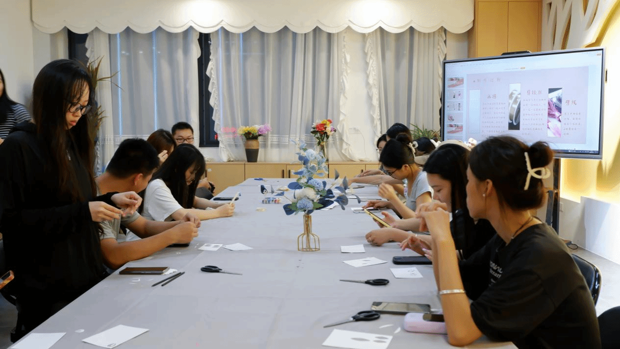 缠花,就是用多色丝线在以纸板和铜丝扎成的人造坯架或实物坯架上缠绕出花、鸟、果、汉字等美术品,源于明代,盛于清代,是国家非物质文化遗产。6月3日晚上,6教1004云沐工作室内师生们体验非遗缠花技艺。
