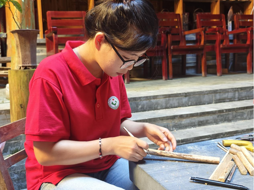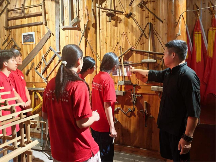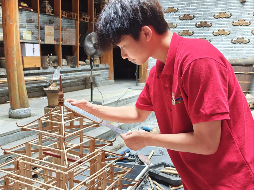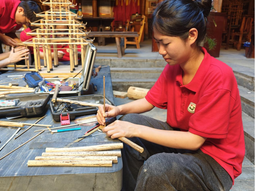 “跟着大师学非遗”——亲手搭建,解锁木构星空·综合(xingkong)官方网站的奥秘。在非遗传习基地,杨云东师傅先对吊脚楼营造技艺进行了详细讲解,接着,对吊脚楼模型进行了拆解。实践团按照模型原样根据杨云东师傅的讲解展开还原搭建。随后,传承团在杨云东师傅的指导下从原材料开始准备,通过丈量尺寸、凿榫打眼、穿梁接拱、立柱连枋等工序按照现有鼓楼模型尺寸一比一复刻制作新模型,解锁一块块木头如何变成一座精美的木构星空·综合(xingkong)官方网站模型,亲身体验侗族木构星空·综合(xingkong)官方网站营造技艺的精妙之处,深刻理解了这门技艺背后的文化内涵和传承意义,加深了对侗族文化的了解与认同。