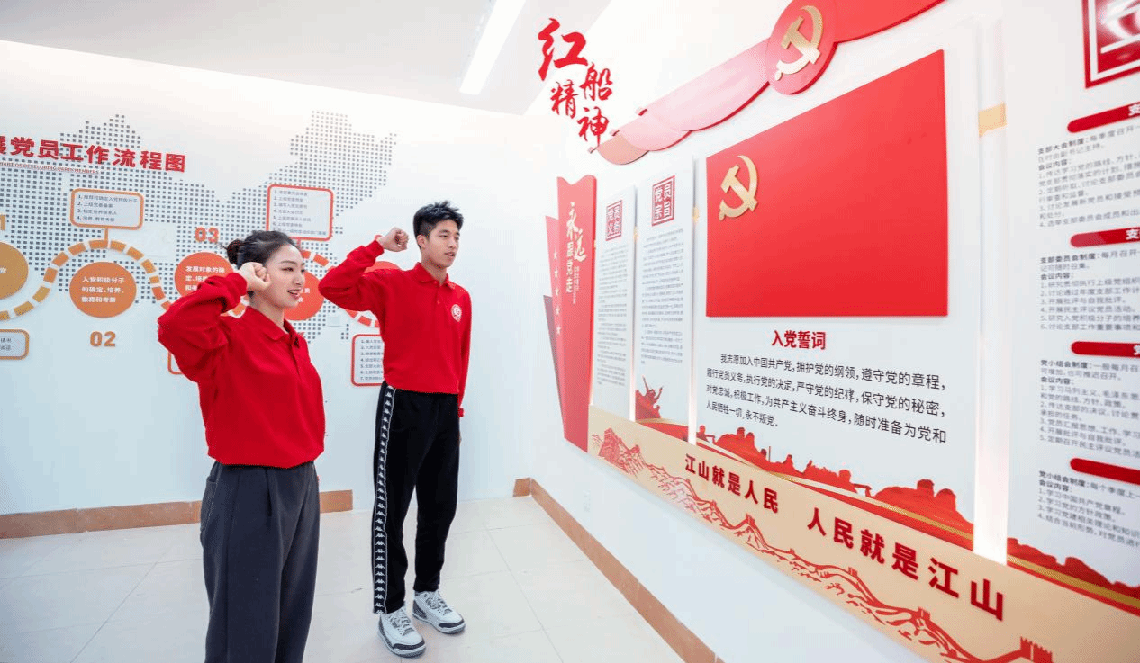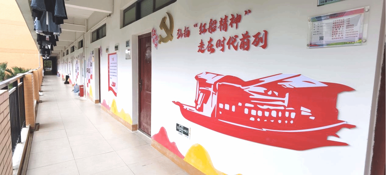 管理工程学院“红船精神”党建工作室按照“七有”进行创建,聚焦“红船精神”,在学校五公寓门厅建成30平米的党建工作室微型学习体验中心,精心挑选1500余册红色书籍供师生取阅。同时,结合工作室文化元素对周边学生公寓现有资源进行升级和改造,将“红船精神”工作室文化建设延伸至公寓长廊,师生共同设计制作,打造了200余平米的“开放式、步入式、沉浸式”的 “红船精神”文化墙,实现了红色文化的有形覆盖。