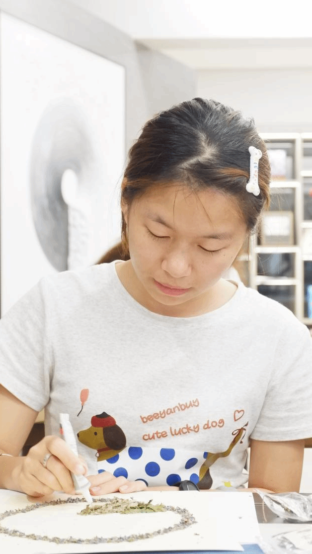 活动中,学生们在了解中草药的分类和作用,制作方法和注意事项后,纷纷燃起了对中草药香氛画制作的兴趣,开始运用粘、贴、拼、嵌等技艺,将中草药当做“画笔”和“颜料”,创作出一幅幅独具特色的画作。