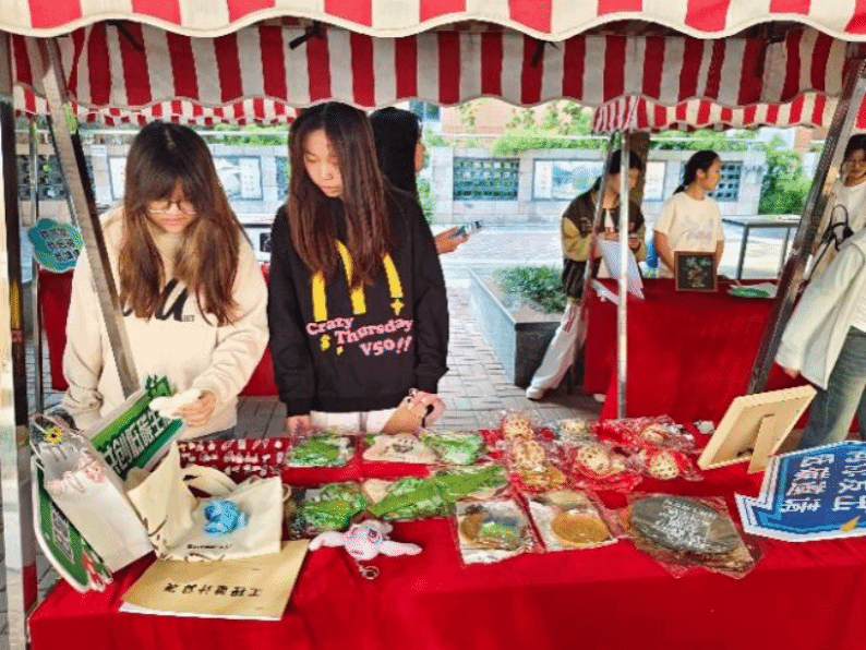 在市集上,琳琅满目的旧物整齐排列,每一件都承载着过往的故事,也蕴含着崭新的可能。同学们穿梭于摊位间,挑选心仪物品,并分享着与旧物的故事。
