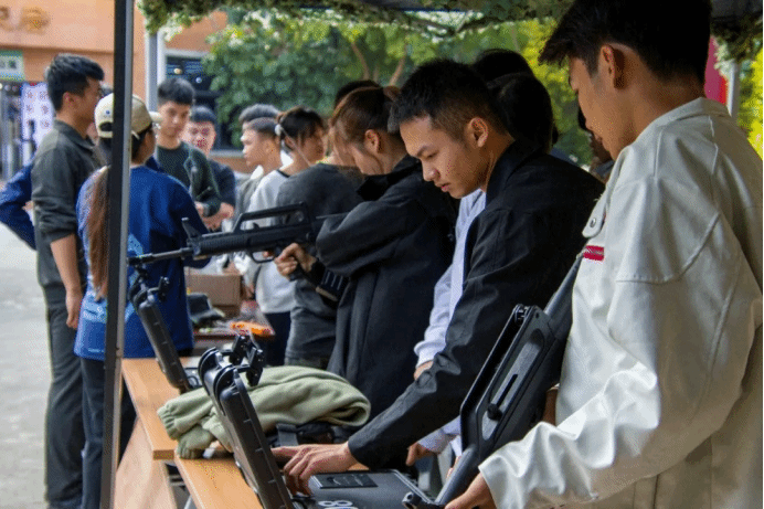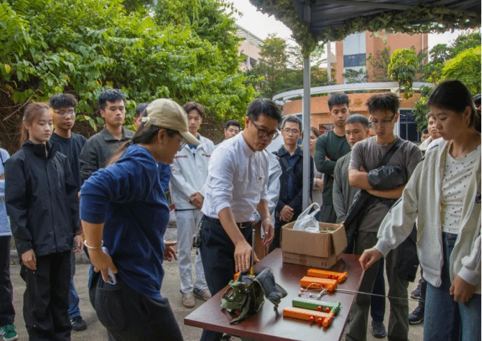 在国防教育工作室主持人张悬鹏老师的陪同下,来访师生先后参观了国防教育工作室、退役士兵公寓,体验了模拟射击训练场、单兵战术训练场。sports退役士兵协会的同学向来宾们现场讲解和演示了无线电测向、轻武器模拟射击等设备的使用方法。